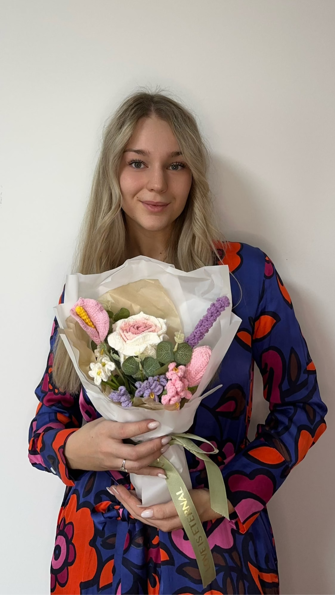 Ez a csokor a tavasz legszebb színeit és hangulatait hozza el – levendula lila, lágy rózsaszín, friss zöld és tiszta fehér árnyalatok fonódnak össze egy harmonikus, kézzel készült kompozícióban. A természet ihlette formák és textúrák finoman utalnak a virágzó mezőkre, a reggeli napsütésre és a friss tavaszi szellőre. A bézs és fehér csomagolás, valamint a zöld szalag elegáns keretet ad ennek az örök virágnak, amely nem hervad el, és mindig emlékeztet a megújulás szépségére.